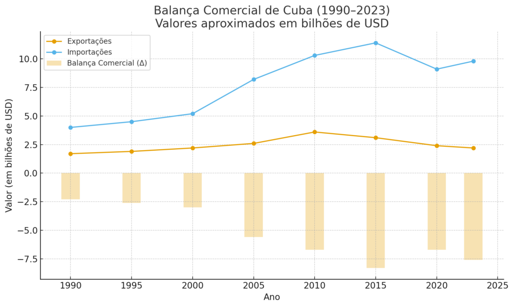 O gráfico acima mostra a evolução aproximada da balança comercial de Cuba entre 1990 e 2023, com base em dados públicos do World Bank, UN Comtrade e Trading Economics. A linha azul representa as exportações, e a linha laranja representa as importações. É possível observar que, durante todo o período analisado, o país importou muito mais do que exportou, acumulando déficits comerciais persistentes que variam de US$ 2 a US$ 7 bilhões anuais.