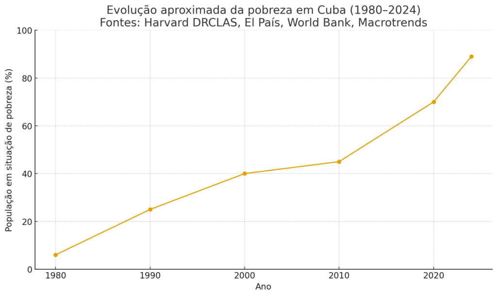 O gráfico acima mostra a evolução aproximada do índice de pobreza em Cuba entre 1980 e 2024, com base em dados de fontes internacionais e relatórios acadêmicos. Ele revela uma curva ascendente e contínua desde o final da década de 1980, marcando o colapso do modelo socialista cubano após o fim da União Soviética. Em 1980, estudos da Harvard DRCLAS (2020) apontavam que apenas cerca de 6% da população vivia em condições de pobreza — uma taxa artificialmente baixa, sustentada por pesados subsídios soviéticos e estatísticas controladas pelo regime.