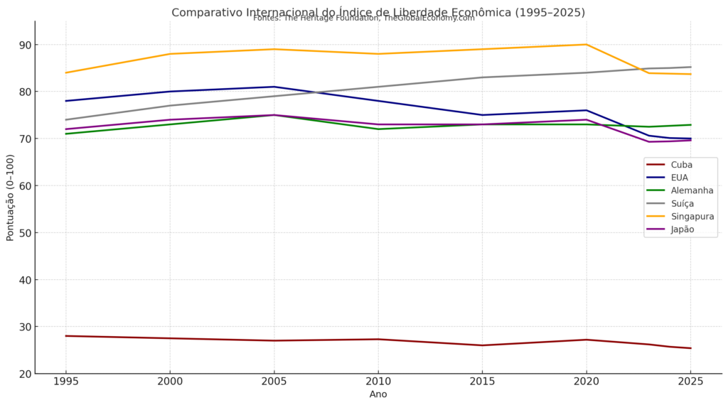 Segundo o Index of Economic Freedom (1995–2025), compilado pela Heritage Foundation e pela base de dados TheGlobalEconomy.com, Cuba figura consistentemente entre as três economias menos livres do planeta, ao lado de regimes autoritários como Coreia do Norte e Venezuela. Desde a década de 1990, a pontuação cubana praticamente não mudou, girando em torno dos 25 pontos, mesmo após reformas pontuais e tentativas cosméticas de abertura. Isso demonstra que o problema de Cuba não é conjuntural, mas estrutural: o próprio sistema socialista impede o florescimento da propriedade privada, da livre concorrência e do direito de escolha do indivíduo.