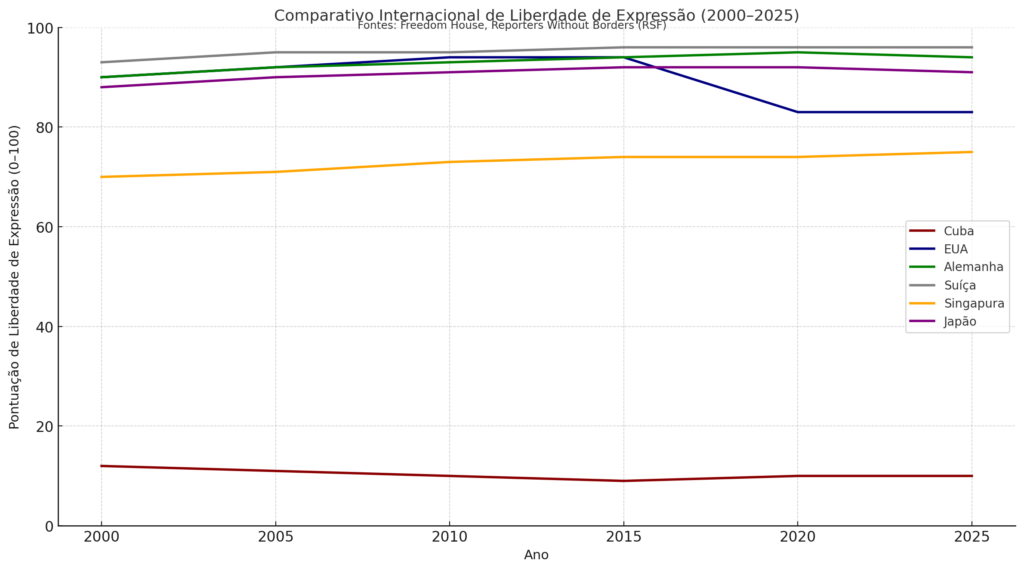 O gráfico acima, baseado em dados da Freedom House e da Repórteres Sem Fronteiras (RSF), compara o nível de liberdade de expressão em Cuba, Estados Unidos, Alemanha, Suíça, Singapura e Japão entre 2000 e 2025. As linhas representam o grau de liberdade em uma escala de 0 a 100, onde valores mais altos indicam maior respeito à livre imprensa, opinião e pensamento. Os resultados são claros: Cuba permanece isolada no extremo inferior, com pontuações em torno de 10, sendo uma das nações mais repressoras do mundo. Nesse contexto, a censura estatal, a perseguição a jornalistas independentes e o controle total da informação transformaram o país em um laboratório de silêncio — um exemplo extremo do que acontece quando o Estado assume o monopólio da verdade.