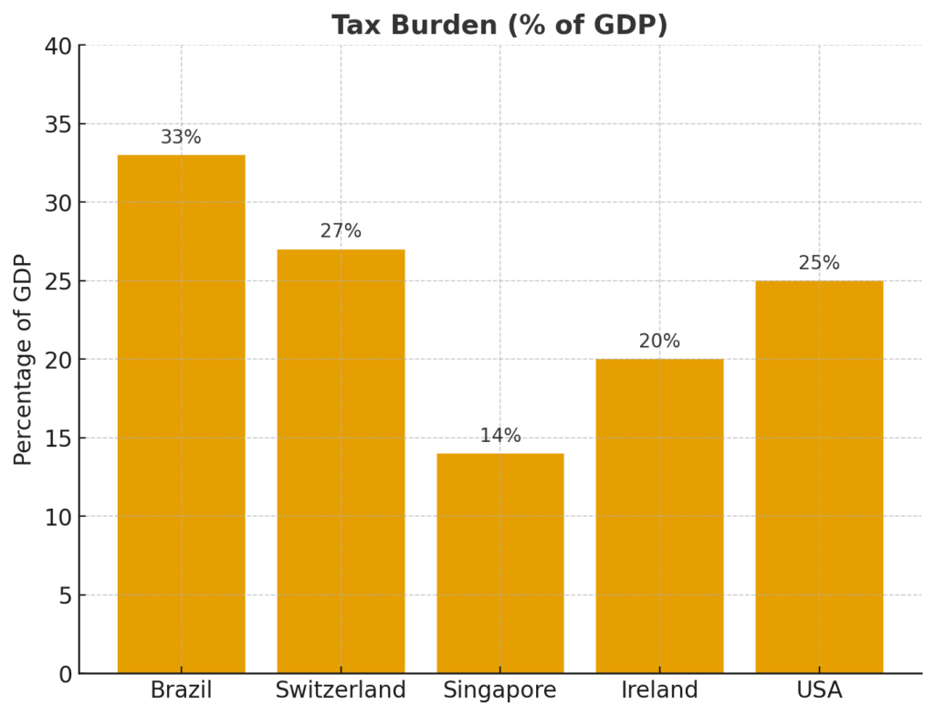 Países com menor carga tributária prosperam mais. Singapura, Irlanda e Suíça, que figuram entre os mais livres e ricos, mantêm cargas abaixo de 25% do PIB (Heritage Foundation, 2024). O contraste com o Brasil é evidente.